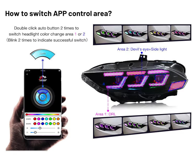 You can control brightness, colors, and modes via mobile app, remote, or original car settings depending on the model.